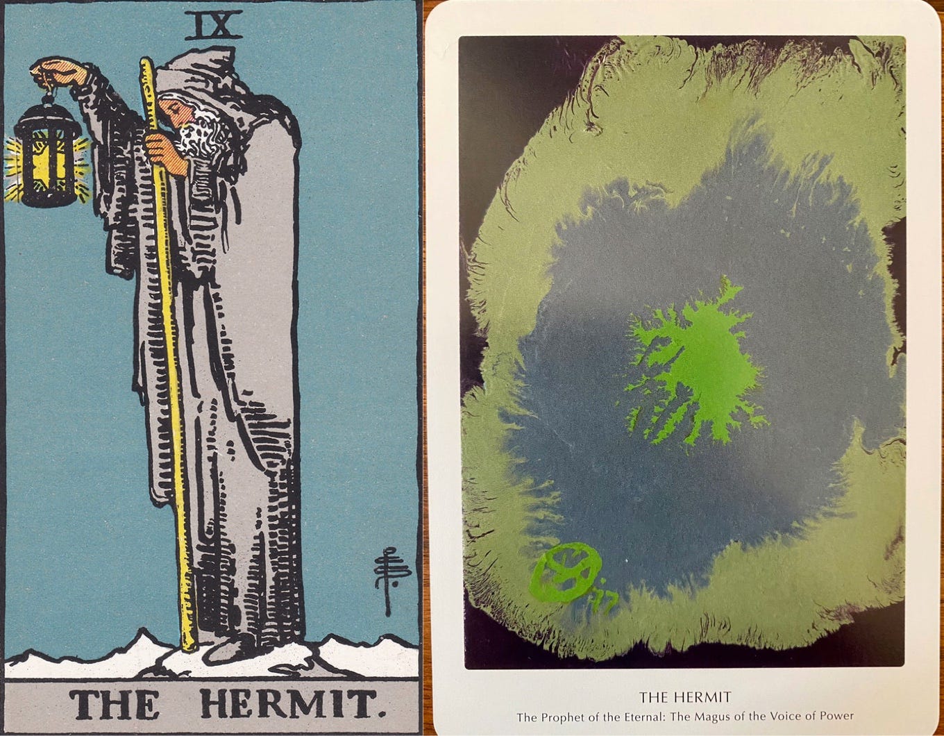 O Eremita é o Sábio que foi liberado da Roda de Nascimento e Renascimento, a Roda da Necessidade, e que atingiu a união da consciência pessoal com a Vontade Cósmica.