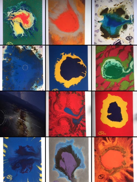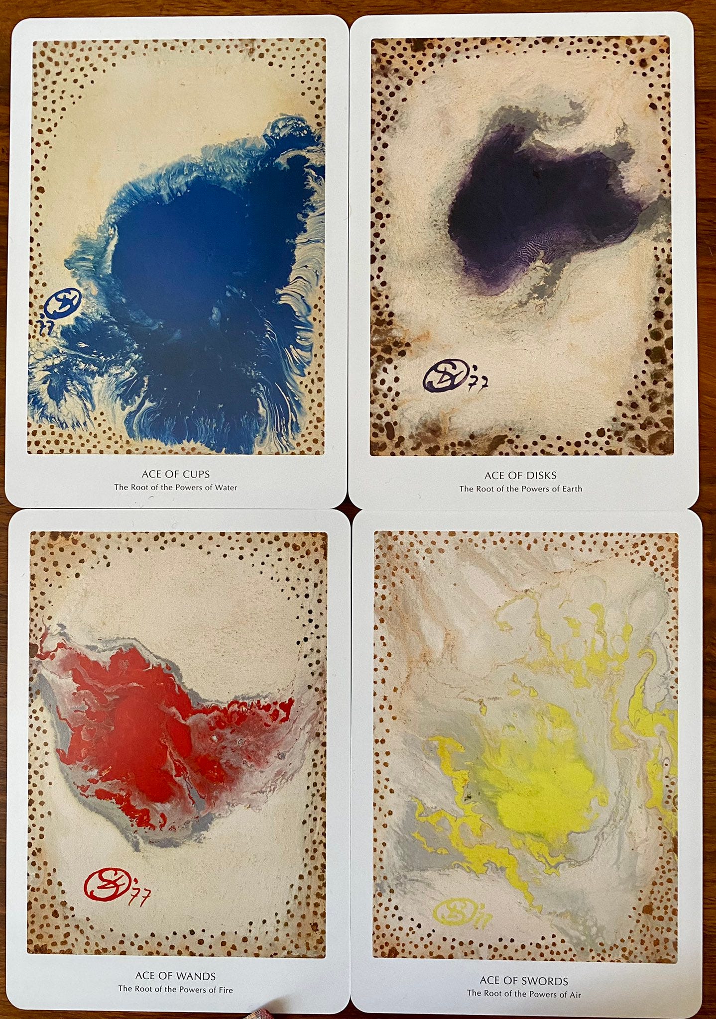 “Este projeto para um baralho de Taro”, diz ela no texto de apresentação, “é ao mesmo tempo pessoal e tradicional. Ele apresenta a essência de cada carta através dos meios não-figurativos da cor pura, aplicada automaticamente, à maneira do movimento Psicomorfológico no Surrealismo.”