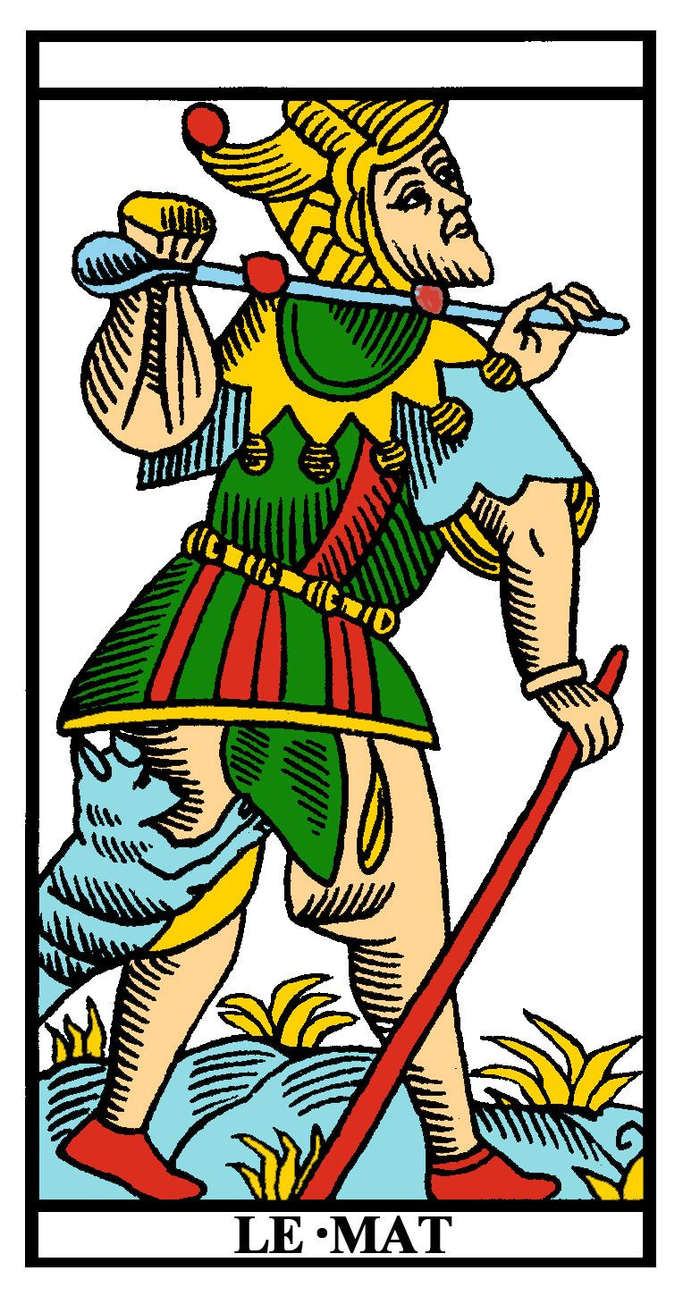 Fool, porém, vem do francês arcaico fol (francês moderno fou), que quer dizer louco, insano, e não bobo. E o título original do Arcano em francês era Le Mat, que remete diretamente ao nome que a carta recebeu nos baralhos italianos mais antigos, Il Matto, que não só quer dizer louco como, ainda por cima, se origina do latim mattus… bêbado, intoxicado, exatamente o adjetivo que os romanos usavam para descrever seu Dionísio-Baco.