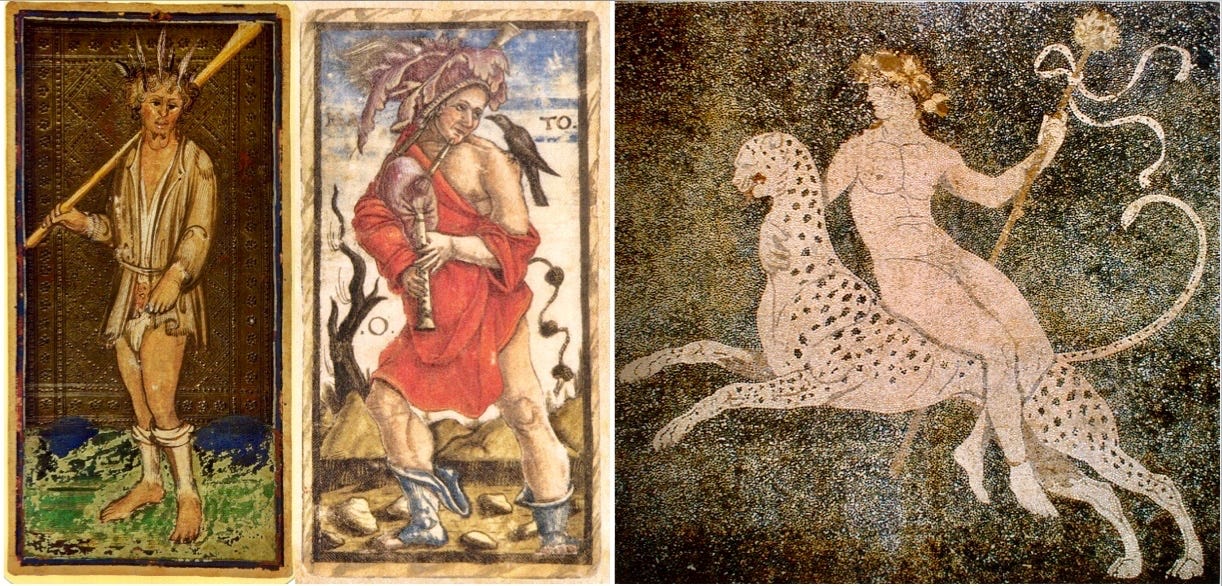 Falamos dos Tarôs italianos mais antigos, e neles podemos encontrar evidências adicionais de que era Dionísio que os criadores do Tarô tinham em mente ao desenhar Il Matto. A essas alturas, não deve surpreender ninguém descobrir que nos dois primeiros Tarôs europeus que se conhece, o Visconti-Sforza (1451) e o Sola Busca (1491), o Louco não ostenta o barrete típico do Bobo da Corte medieval, mas uma coroa de folhas que é um dos principais atributos iconográficos de Dionísio, presente desde as representações gregas mais arcaicas até as pinturas renascentistas.
